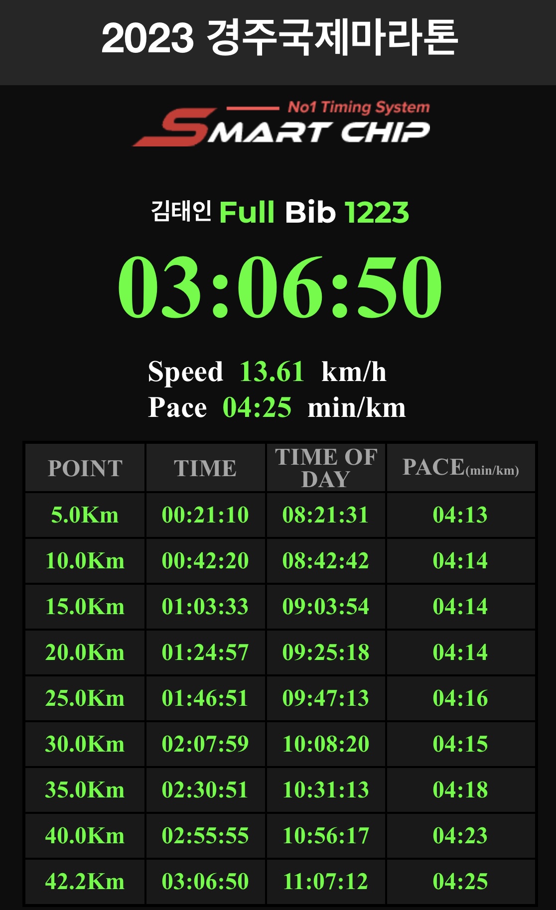 최종 기록은 3시간 06분 50초. 아쉬움도 있었지만, 응원과 좋은 코스 덕분에 즐거운 대회였다.