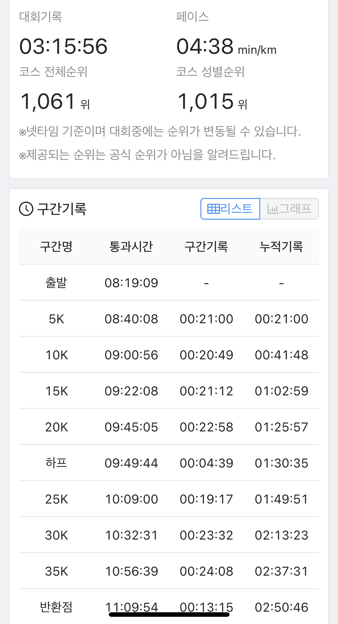 D조에서 출발해 초중반 오버페이스를 하는 전략을 택했는데, 많은 주자를 제치느라 힘들었다. 19km 지점에서 급히 화장실을 다녀오느라 리듬이 깨지고 페이스가 크게 떨어졌다.