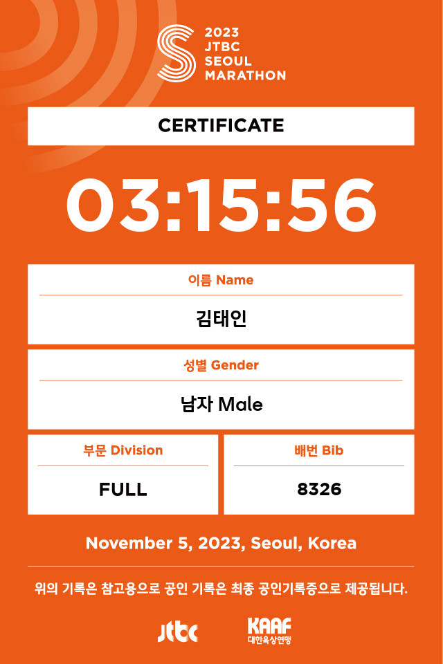 최종 기록은 3시간 15분 56초로 완주했다. 달리기 조언을 해주는 분께 ‘그것도 실력이다’라는 말을 들으며 반성도 했다.